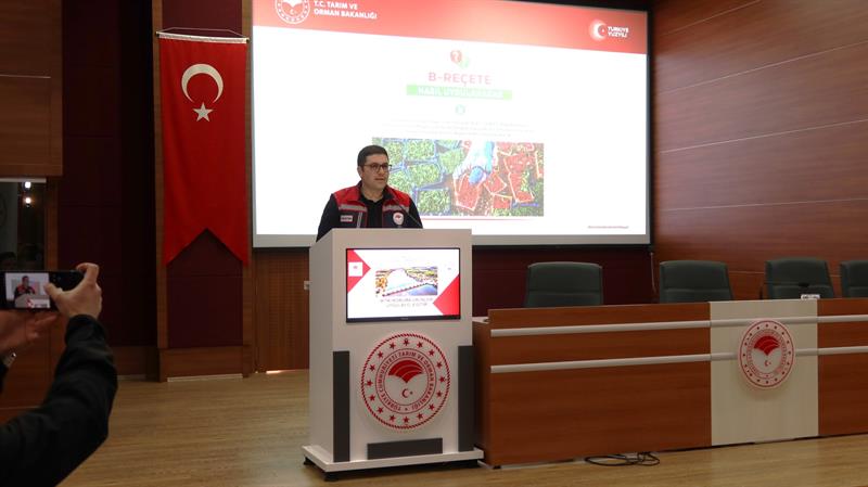 İl Müdürümüz ayrıca B-Reçete Sistemi'nin, bitki koruma ürünlerinin kayıt altına alınarak reçeteli şekilde kullanılmasını sağlayan önemli bir mekanizma olduğunu vurguladı. Sistem halihazırda 4 pilot ilde (Ankara, Samsun, Mersin ve Kırklareli) uygulanmakta olup, 01.07.2026 tarihinden itibaren tüm illerde aktif hale geleceğini söyledi.