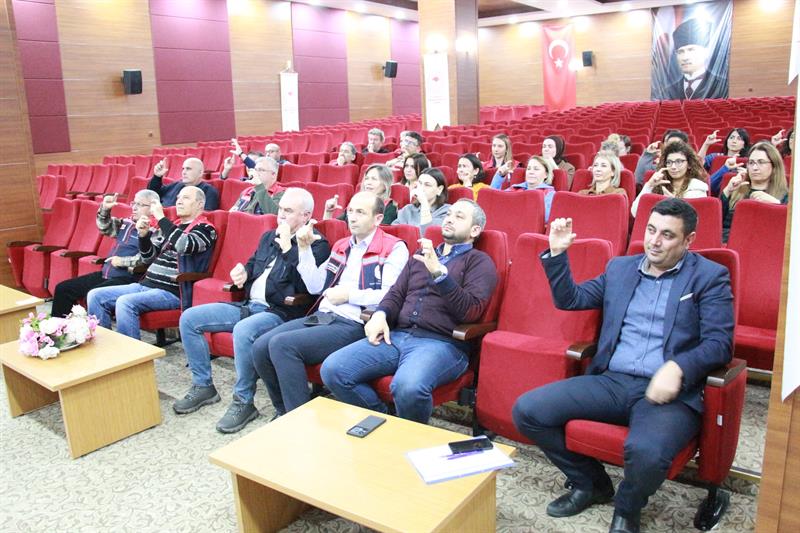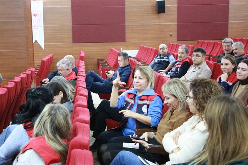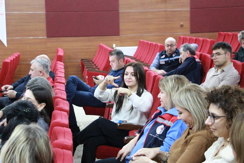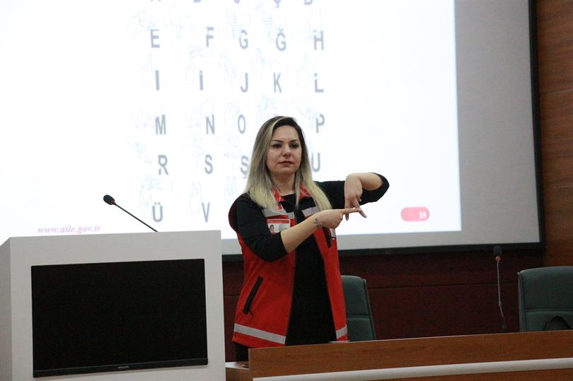 Eğitimde, Türk İşaret Dili Tercümanı Petek Kızılcan Topaloğlu tarafından sunumlar eşliğinde Türk İşaret Dili'nin temel yapısı, sağır toplumunun iletişim biçimleri ve günlük hayatta dikkat edilmesi gereken hususlar hakkında bilgilendirme yapıldı.